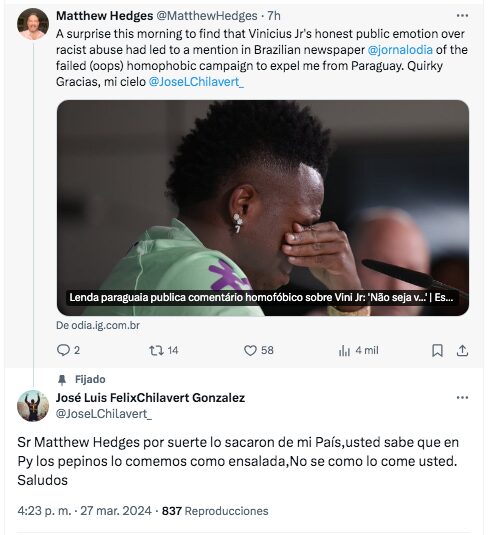 „Es war eine Überraschung, heute Morgen zu erfahren, dass die ehrliche öffentliche Aufregung von Vinicius Jr. über rassistische Beleidigungen dazu geführt hatte, dass in der brasilianischen Zeitung @jornalodia die gescheiterte (ups) homophobe Kampagne, mich aus Paraguay auszuweisen, erwähnt wurde. Eigenartig. Danke, mein Himmel, @JoseLChilavert“, schrieb er.