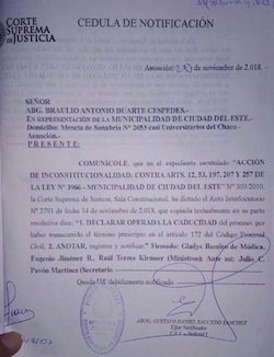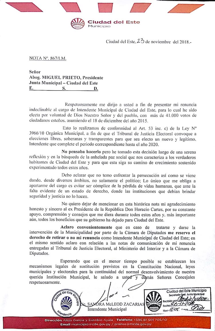 Die Minister des Wahlgerichtes nahmen das Kündigungsschreiben der Bürgermeisterin von Ciudad del Este offiziell an. Obwohl normalerweise der Stadtrat dies billigen müsste, bezog sich McLeod auf eine Verfassungswidrigkeitsaktion aus dem Jahr 2010, welche dem Stadtrat jegliche Interventionen verbietet.