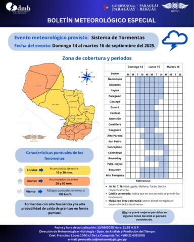 Asunción: Das Direktionsamt für Meteorologie und Hydrologie hat ein spezielles Wetterbulletin herausgegeben, das auf ein bevorstehendes Sturmsystem hinweist, das von Sonntag, dem 14., bis Dienstag, dem 16. September 2025, andauern wird.